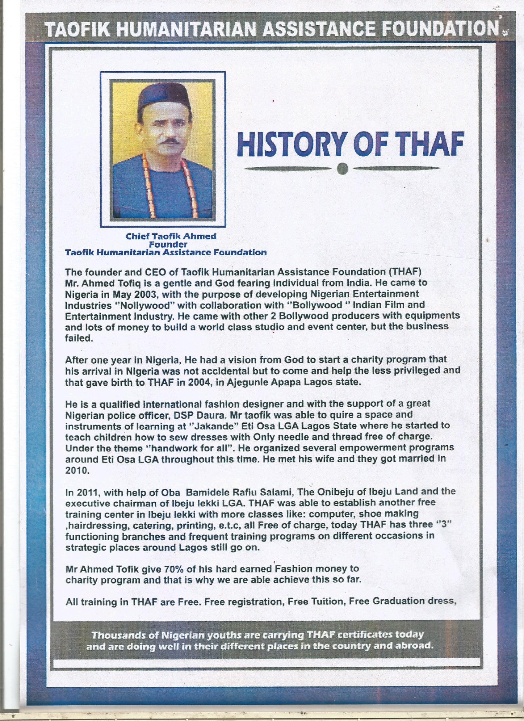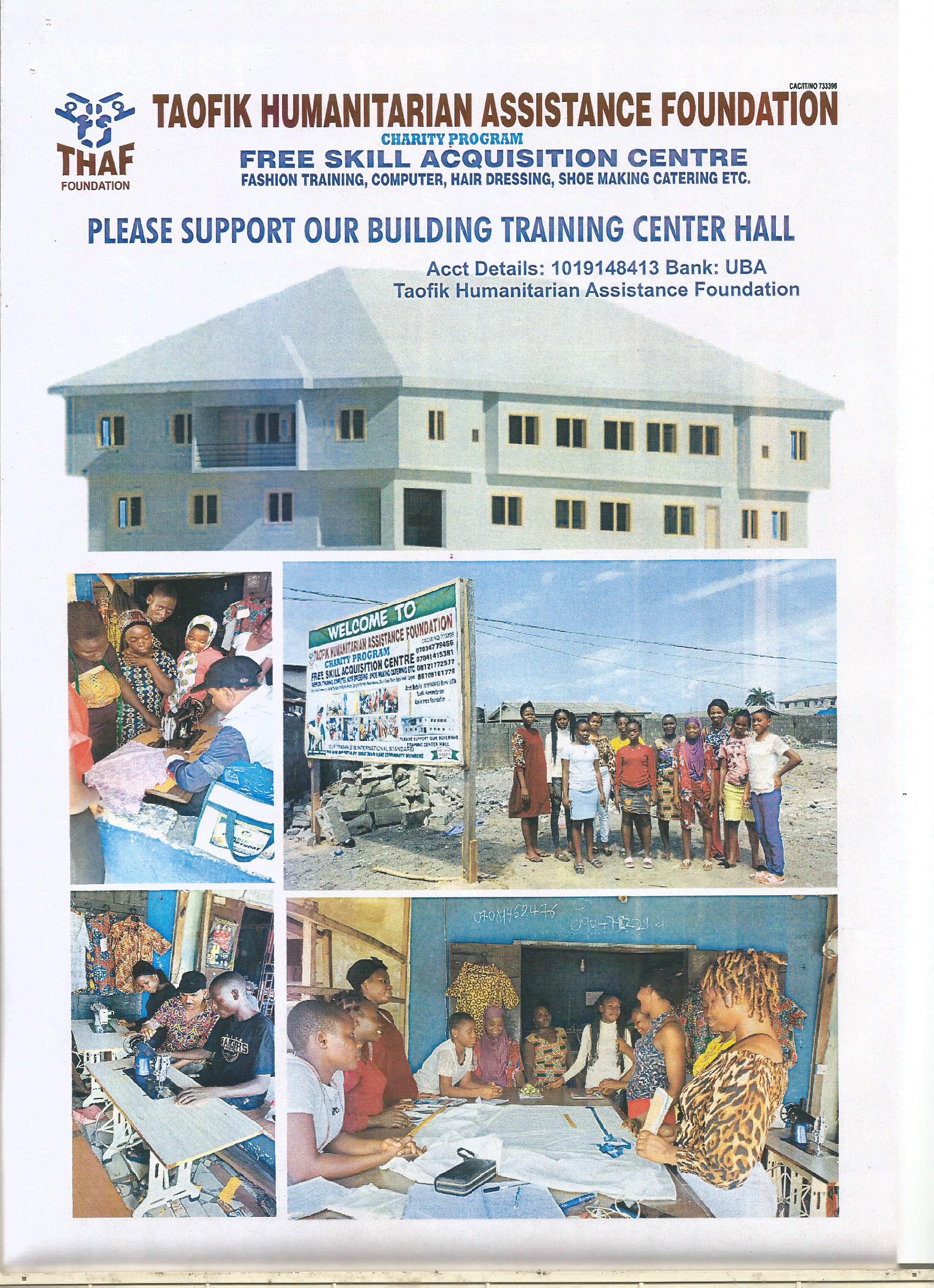 TAOFIK HUMANITARIAN ASSISTANCE FOUNDATION (THAF) is a non-governmental organization committed to improving lives through economic empowerment, education, cultural promotion, and creative engagement. We focus on uplifting adults, youth, and children—especially the underprivileged—by providing free access to skills training, moral development, and support in education, entertainment, tourism, and sports.